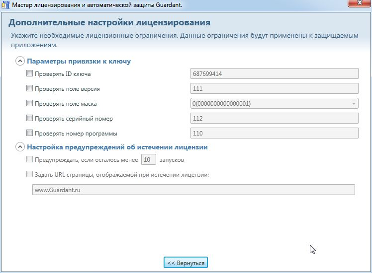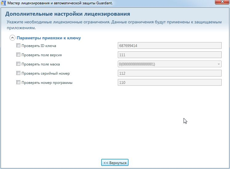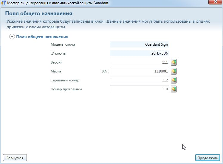 Далее в появившемся окне можно указать значения полей общего назначения ключа, к которым будут привязаны опции защиты. По умолчанию вставляются значения, которые записаны в ключ.