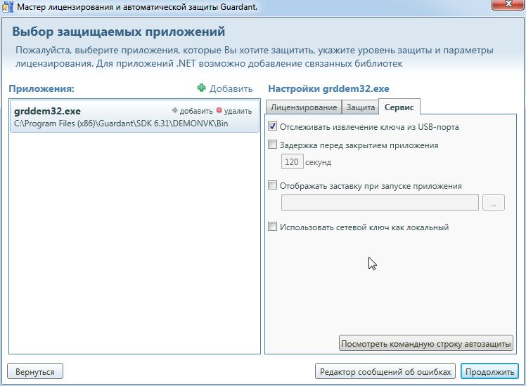 В меню «Сервис» вы сможете настроить отслеживание извлечения ключа из USB-порта, а так же настроить заставку при запуске приложения и просмотреть командную строку автозащиты, которая может пригодиться при работе с консольной утилитой защиты Native-приложений nwkey32.exe.