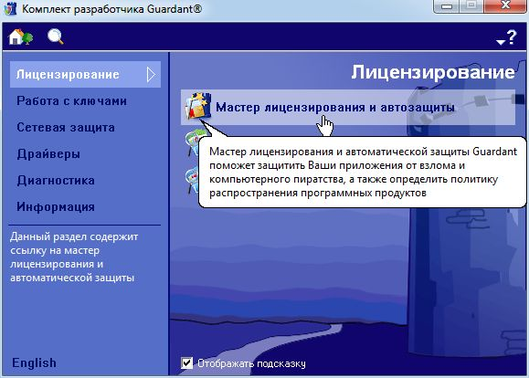 Теперь можно перейти к процессу защиты ПО. Для этого в окне комплекта разработчика выберите вкладку лицензирование и далее пункт «Мастер лицензирования и автоматической защиты»