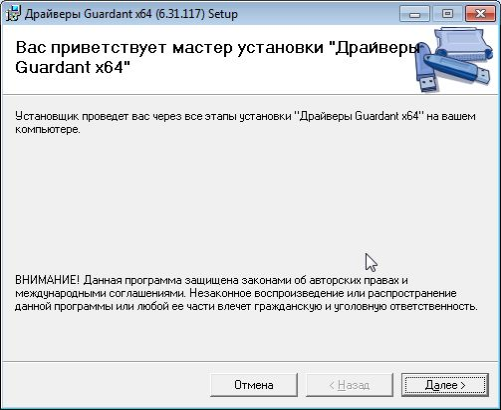 В ходе установки вам будет предложено установить драйверы Guardant необходимой для системы разрядности. Если драйверы не установлены то нажимаем [Далее] и ждём завершения работы мастера установки.