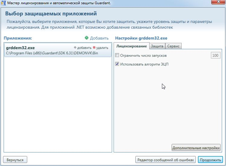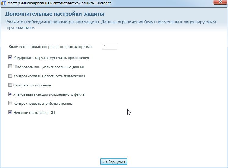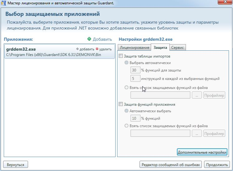 В данном меню так же присутствуют дополнительные настройки для построения защиты ПО