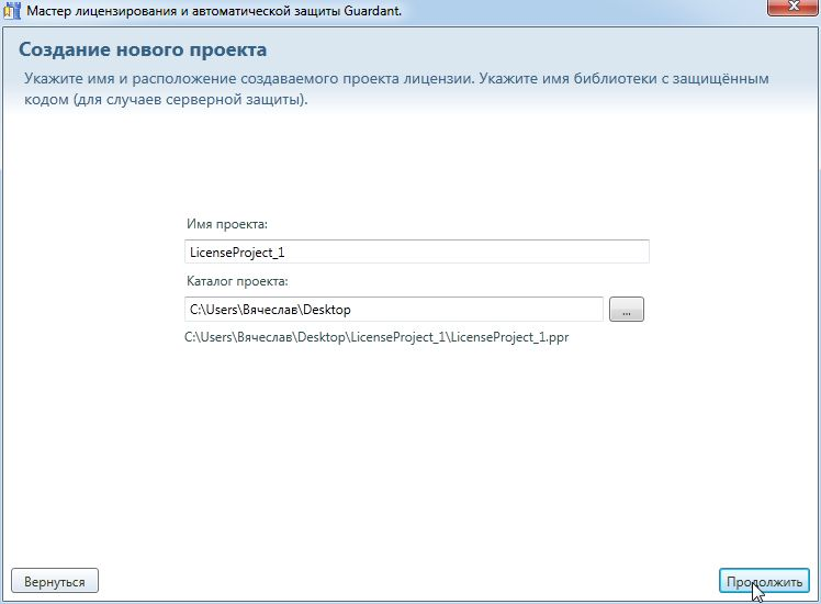 Далее указываем имя проекта защиты и директорию в которой будет находится результат. После выбора нажимаем [Продолжить]