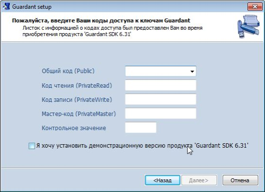 Если у вас нет кодов доступа и вы хотите использовать демонстрационные коды доступа для ознакомления с проектом Guardant выбираем, указанный на скриншоте, пункт.
