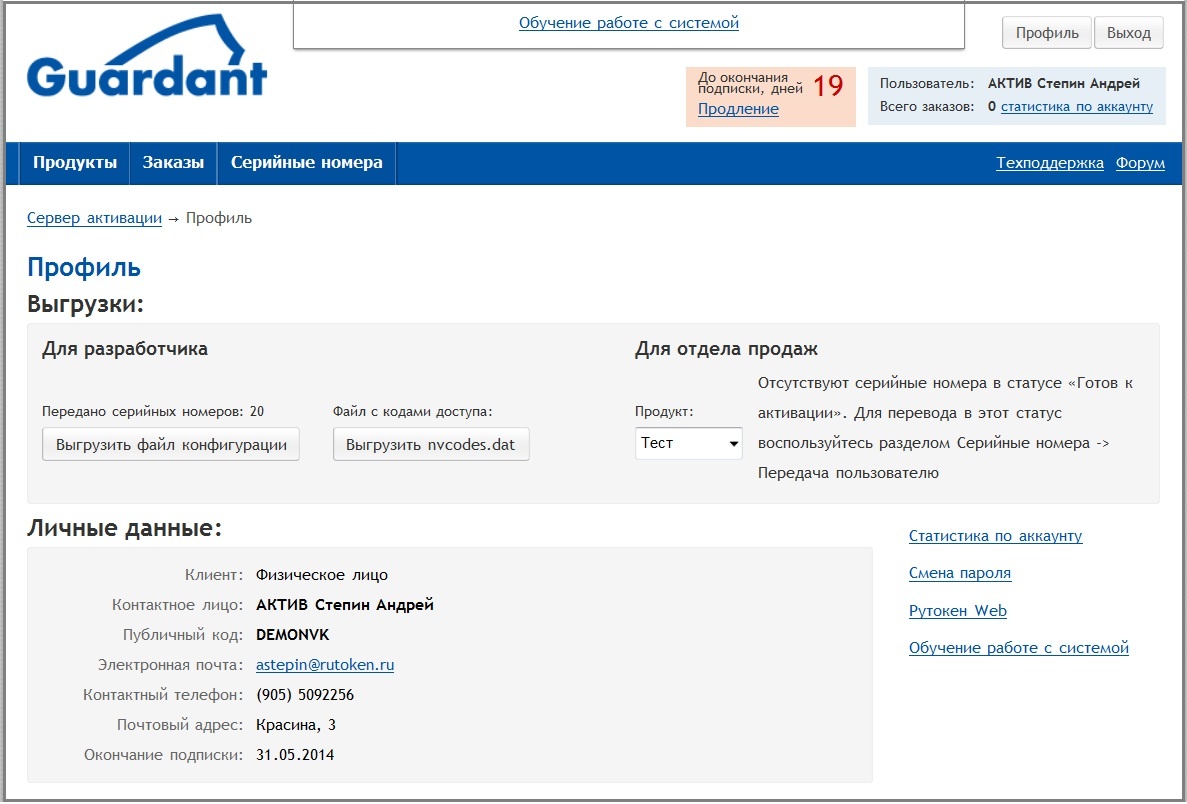 По нажатию кнопки Профиль, расположенной в верхней правой части экрана, выводятся регистрационные данные владельца текущего аккаунта, а также осуществляется доступ к сервисным операциям, повышающим удобство работы с Сервером активации.