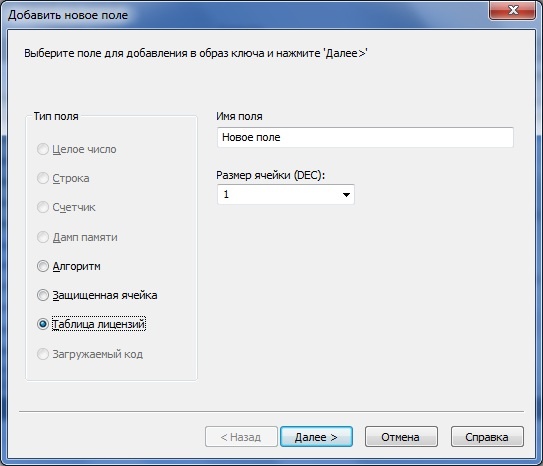 В появившемся диалоге выберите тип поля Таблица лицензий, задайте имя таблицы и выберите размер ее ячейки: