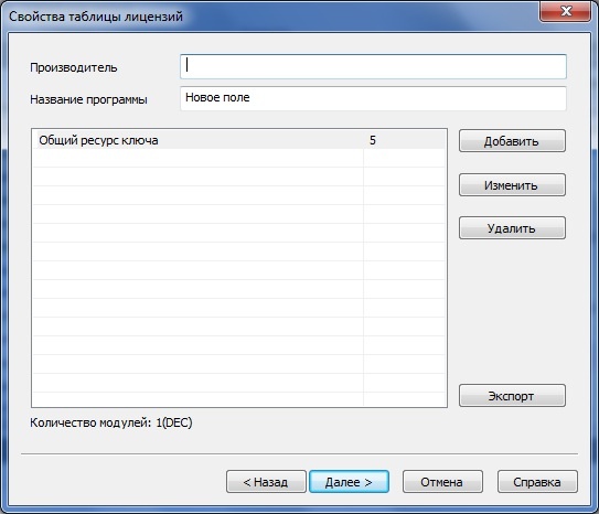 Поля Имя модуля и Лицензии служат для ввода названия модуля и количества лицензий соответственно.