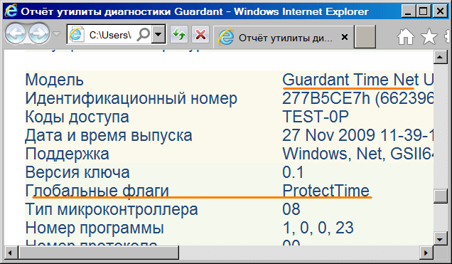 Чтобы проверить, блокирована ли возможность изменения времени в ключе, выполните его диагностику (см. предыдущий пункт или описание утилиты диагностики). Глобальный флаг ProtectTime должен быть установлен: