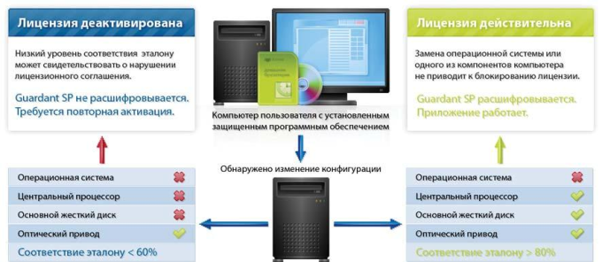 Guardant SP – это софтверная реализация Guardant Sign, предоставляющая клиенту практически все те же возможности с точки зрения защиты, что и электронные ключи. Особенностью Guardant SP является криптографическая привязка к оборудованию (т.е. разработчик может наложить ограничения на изменение конфигурации оборудования конечного пользователя).