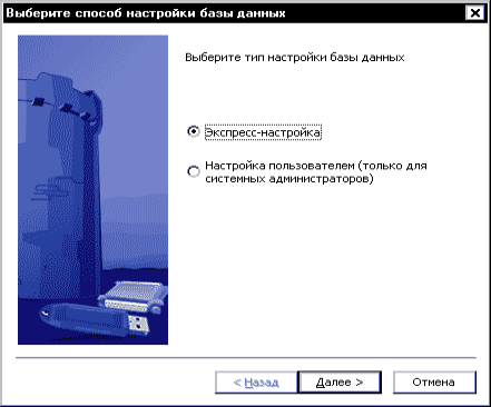 1. На первой странице Мастера выберите тип настройки базы данных Экспресс-настройка: