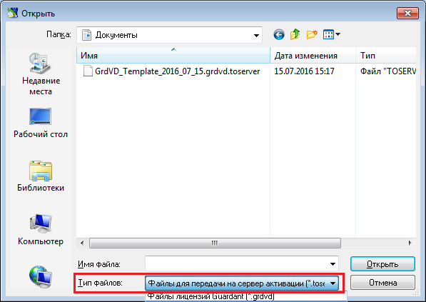 Этот файл необходимо перенести на компьютер, где есть доступ в интернет, запустить мастер активации, нажать кнопку «Указать файл лицензии…» и в выпадающем списке окна навигации указать в поле «Тип файлов:» параметр «Файлы для передачи на сервер активации (*toserver)»: