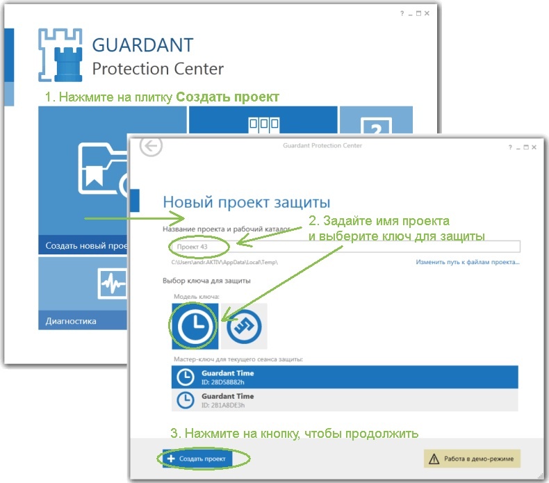 - В открывшемся диалоге задайте имя проекта, тип ключа для защиты (в случае использования аппаратного ключа) или выберите серийный номер (в случае использования софтверного ключа).