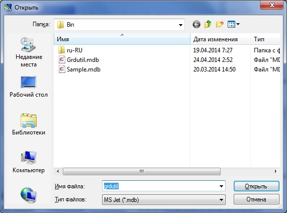 2. После нажатия кнопки [Далее] появляется стандартный системный диалог открытия файла, в котором надо указать путь к файлу базы данных по умолчанию "Program Files (x86)\Guardant\SDK <версия>\Bin\grdutil.mdb":