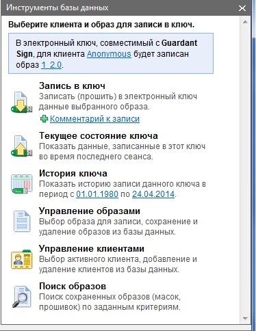 Запись в ключ | Записать (прошить) в электронный ключ данные выбранного образа. | Ключ | (Операции с ключом) Записать образ в ключ База данных | (Операции с ключом) Записать образ в ключ |