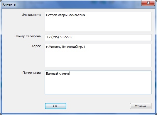Заполните следующие поля ввода: Имя клиента, Номер телефона, Адрес, Примечания. Назначение этих полей следует из их названий. Обязательным для заполнения является только поле Имя клиента.