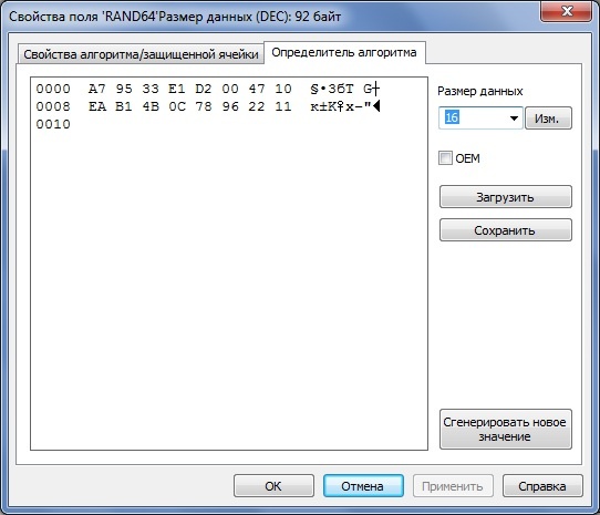 По умолчанию при создании алгоритма в определитель записываются случайные числа. Их можно изменить, сформировав определитель самостоятельно, путем ввода новых значений непосредственно в окне редактора, или автоматически создать новый определитель (кнопка [Сгенерировать новое значение]).