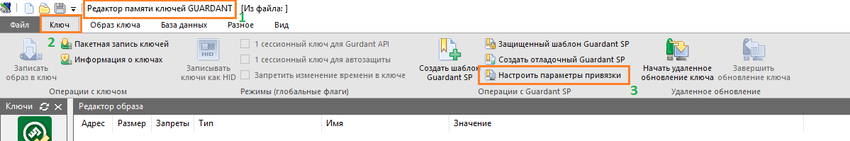 Чтобы определить параметры привязки софтверного ключа к компьютеру, запустите Редактор памяти ключей (grdutil.exe), выберите вкладку Ключ, и далее Настроить параметры привязки.