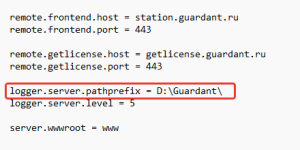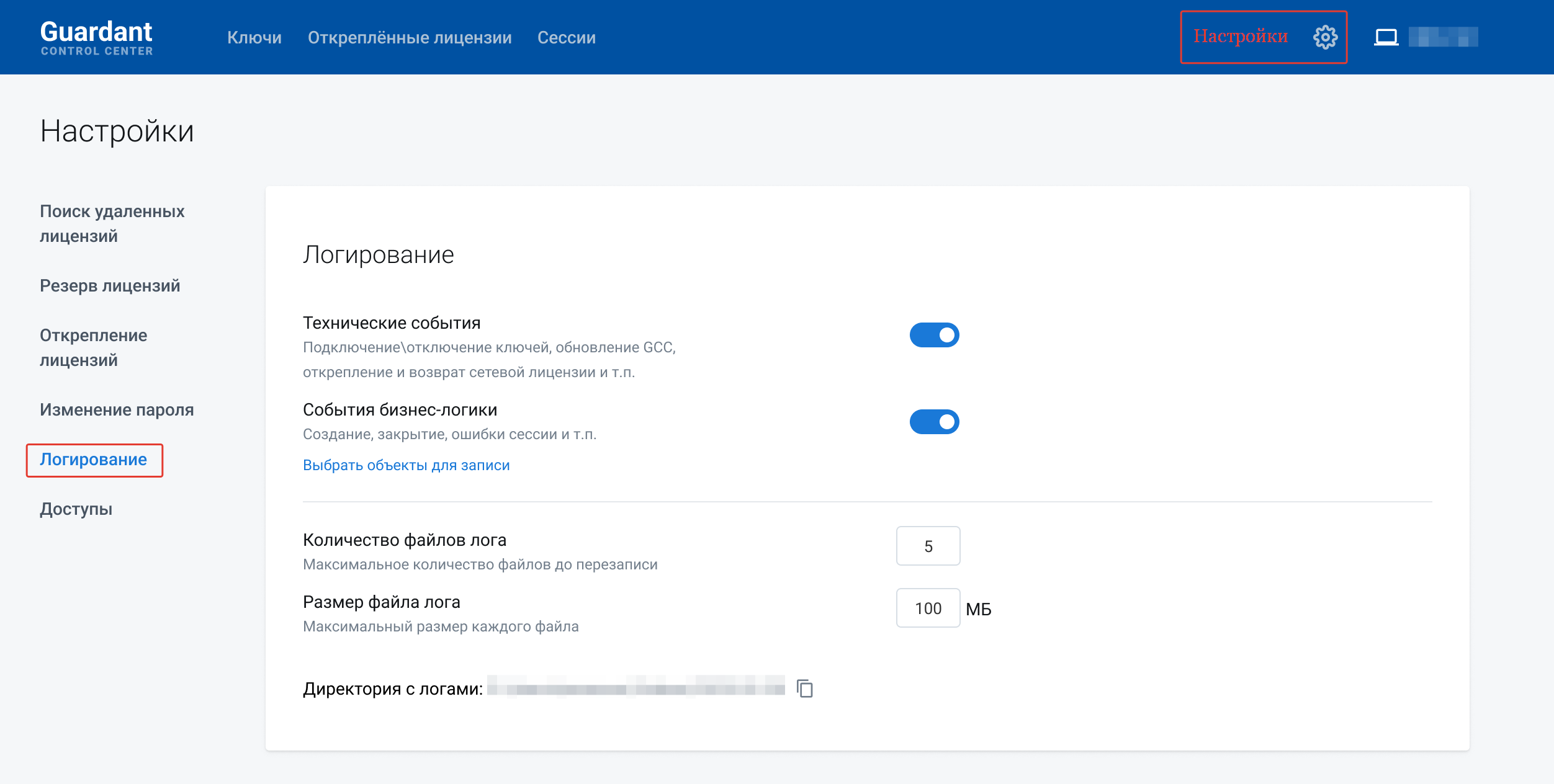 | Максимальное количество лог-файлов в директории хранения | Задается пользователем через интерфейс или конфигурационный файл (C:\ProgramData\Guardant\Control Center\settings) Guardant Control Center . По умолчанию в директории может хранится до 5 лог-файлов | Задается пользователем через интерфейс или конфигурационный файл (/etc/guardant/gcc/settings) Guardant Control Center . По умолчанию в директории может хранится до 5 лог-файлов |