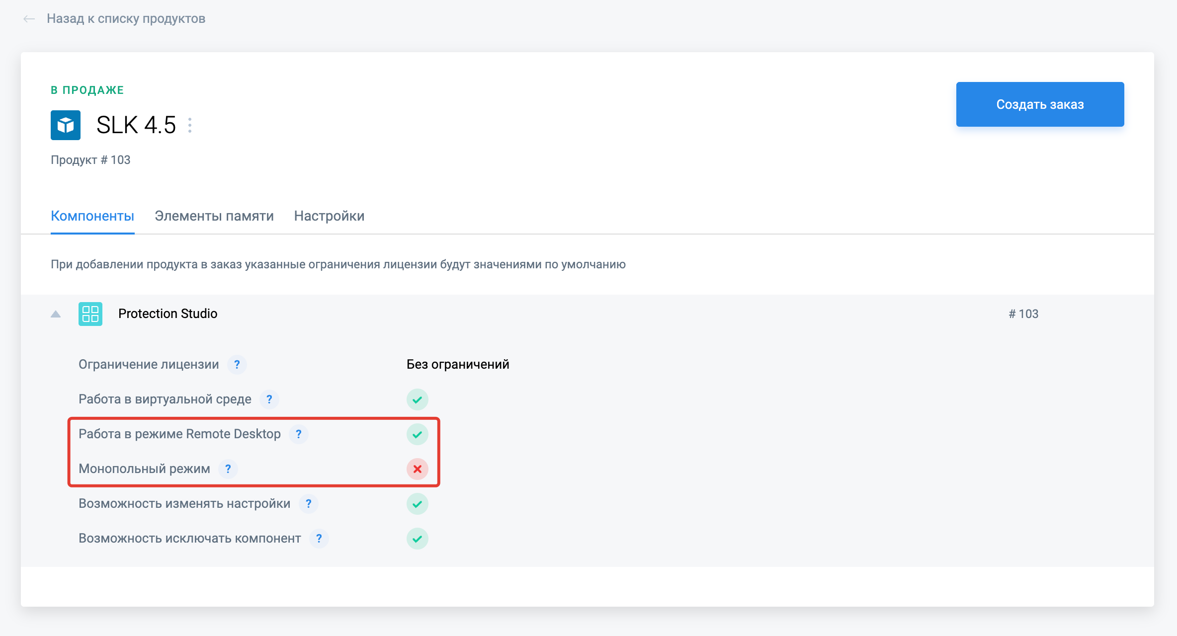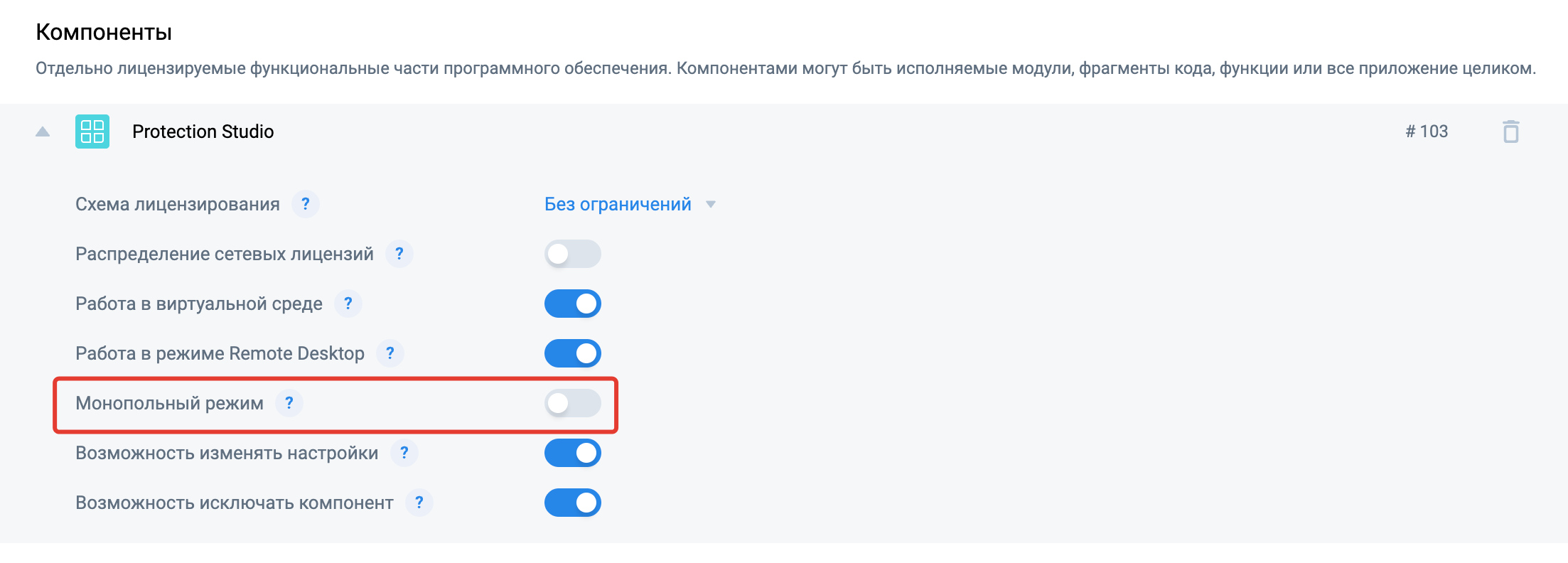 Для всех Компонентов добавится настройка «Монопольный режим». Управлять этой настройкой можно при создании и настройке Продуктов или их модификаций, а также при создании заказов на отгрузку лицензий или на их обновление.