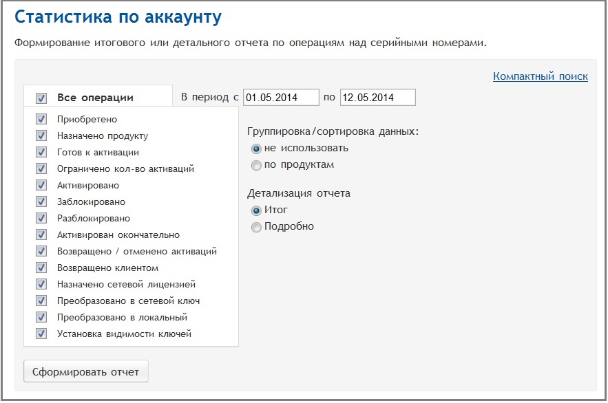 Сервер активации позволяет создавать развернутые отчеты по операциям над серийными номерами, которые производились в данном аккаунте (сравн. с История работы с серийным номером).