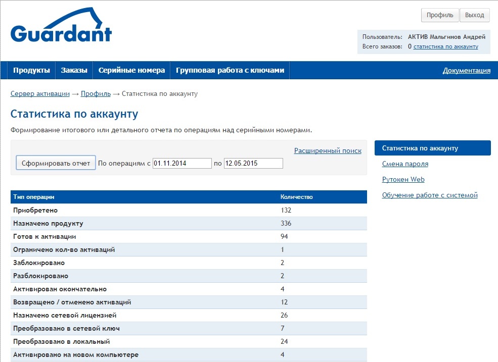 - Перейдите по ссылке Статистика по аккаунту в правой части экрана (при работе с любой страницей Сервера активации) либо нажмите на ссылку Статистика по аккаунту в Профиле пользователя в правой части экрана,