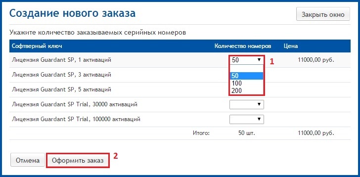 В окне, появившемся на экране, укажите количество заказываемых серийных номеров ключей нужного типа и нажмите на кнопку Оформить заказ: