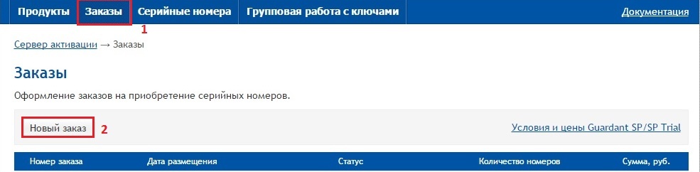 Чтобы оформить заказ на получение серийных номеров, перейдите на страницу Заказы и нажмите на кнопку Новый заказ: