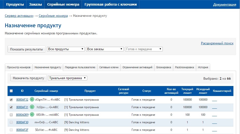 Наиболее быстро и комфортно назначить серийные номера продукту и перевести в статус «Готов к активации» можно с помощью нового раздела - «Групповая работа с ключами». Для просмотра инструкции перейдите по ссылке