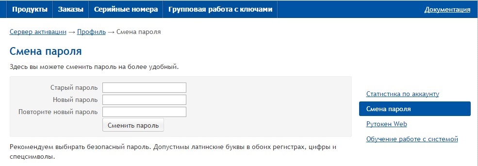 - Перейдите по ссылке Смена пароля в Профиле пользователя в правой части экрана,