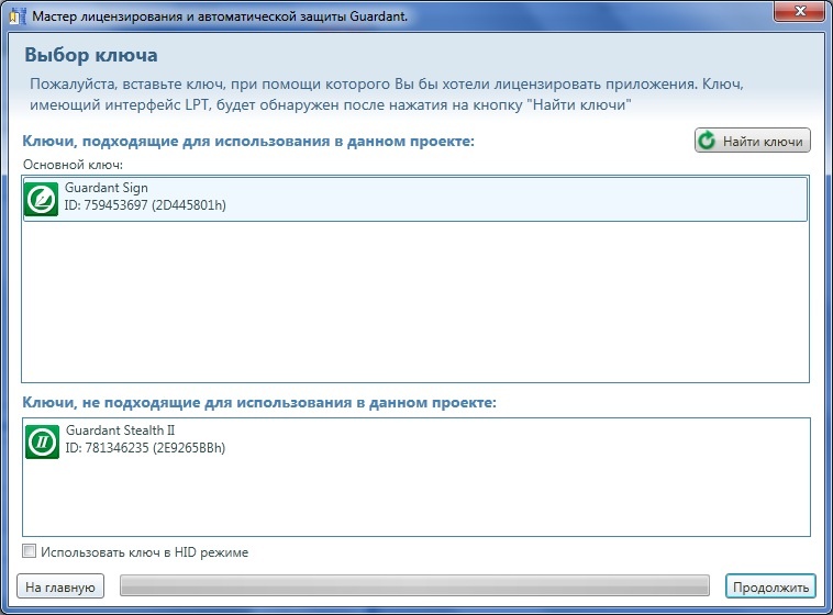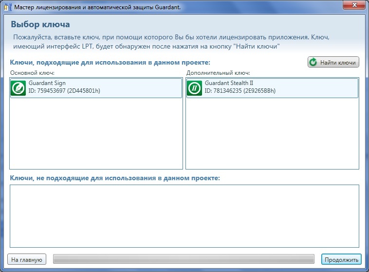 Мастер самостоятельно найдет все подключенные ключи и определит возможность их использования. Если ключ не был вставлен в компьютер на момент перехода на данный шаг, то вставьте ключ. Для ключей с интерфейсом LPT после подключения их к компьютеру необходимо нажать на кнопку Найти ключи.