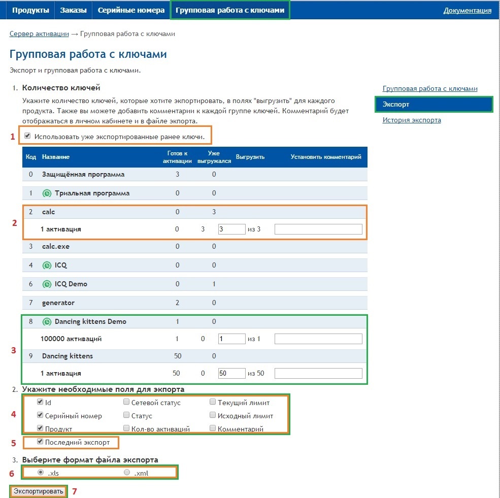 Порядок выгрузки готовых к активации ключей, в пунктах 3,4,6 и 7. А выгрузка ранее выгруженных ключей – пункты 1,2,4,5,6,7.