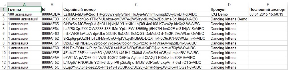Изображение ниже – это образец документа в формате .xls, сформированный в результате работы с формой экспорта. Если ключ был выгружен ранее, то дата и время последнего экспорта будут отражены в поле «Последний экспорт».